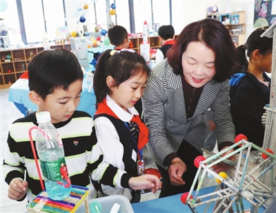 高金鳳(右)在中國(guó)兒童號(hào)科創(chuàng)博物館聽孩子講設(shè)計(jì)創(chuàng)意。 學(xué)校供圖