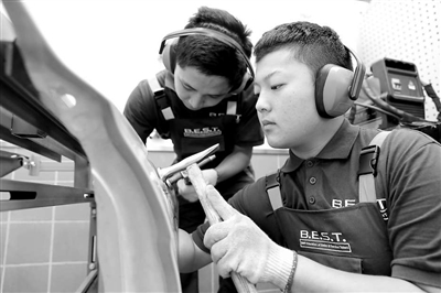 北京市昌平職業(yè)學(xué)校汽修專(zhuān)業(yè)寶馬BEST項(xiàng)目班學(xué)生進(jìn)行實(shí)訓(xùn)。