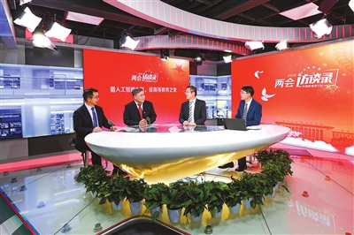 3月3日,全國(guó)政協(xié)常委、中國(guó)科協(xié)副主席、中國(guó)科學(xué)院院士袁亞湘(左三),中國(guó)教育發(fā)展戰(zhàn)略學(xué)會(huì)副會(huì)長(zhǎng)李志民(左二),北京師范大學(xué)智慧學(xué)習(xí)研究院院長(zhǎng)黃榮懷(左一),做客中國(guó)教育報(bào)刊社“兩會(huì)訪(fǎng)談錄”。 本報(bào)記者 單藝偉 攝