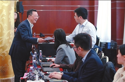 ?、俳逃鐒e小組會(huì)議,全國政協(xié)委員姜耀東(左)將他的發(fā)言記錄校對后,交還給工作人員。