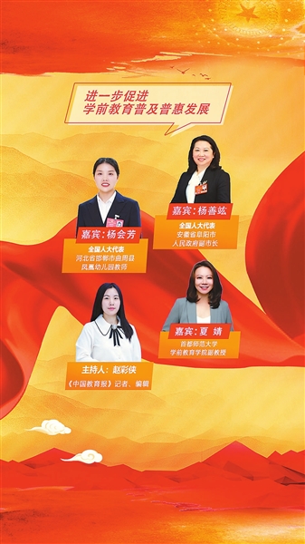 3月9日,全國人大代表、安徽省阜陽市人民政府副市長楊善竑,全國人大代表、河北省邯鄲市曲周縣鳳凰幼兒園教師楊會芳,首都師范大學學前教育學院副教授夏婧,做客中國教育報刊社“兩會訪談錄”,一同探討學前教育普及普惠相關話題。