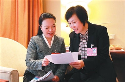 張艷秋(左)與唐景麗一起研究她的建議稿。 本報記者 張學軍 攝
