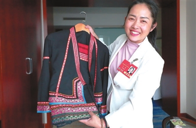 ③3月9日,玉龍向記者展示布朗族傳統(tǒng)服飾,希望更多人關注少數(shù)民族文化的傳承和發(fā)展。