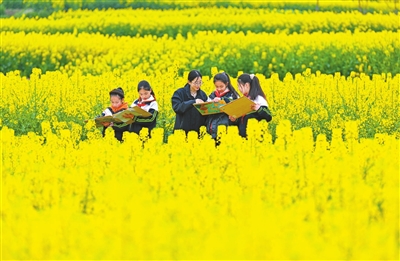 3月13日,四川省眉山市仁壽縣慈航鎮(zhèn)小學(xué)校師生來到油菜基地進(jìn)行田間寫生,用畫筆描繪多彩春光,感受春日的美好。潘建勇 攝