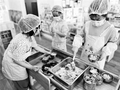 分餐值日生在為孩子們分餐。 錢靜丹 攝