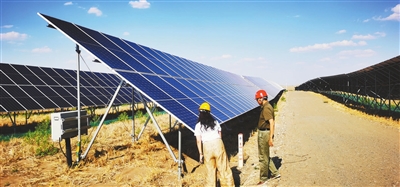 蘭州大學土木工程與力學學院黃寧教授團隊和三峽集團技術人員在查看建在沙漠里的光伏電站光伏板下被風掏蝕的地表,并研究如何解決該問題。學校供圖