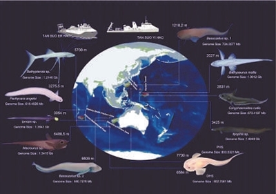 團(tuán)隊(duì)經(jīng)過(guò)多次深海巡航,采集了來(lái)自深海不同區(qū)域的11種魚(yú)類樣本,通過(guò)對(duì)這些樣本的基因組數(shù)據(jù)進(jìn)行深入分析,構(gòu)建了深海魚(yú)類的“生命進(jìn)化樹(shù)”,揭示了脊椎動(dòng)物征服深淵的歷程。結(jié)果顯示,少數(shù)類群的深海魚(yú)類在1億年前便開(kāi)始適應(yīng)深海環(huán)境,而大多數(shù)現(xiàn)存的深海魚(yú)類則是在6500萬(wàn)年前的大滅絕事件后才進(jìn)入深海區(qū)域。