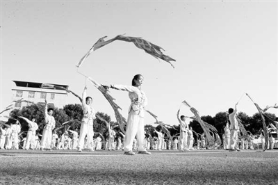 在湖南省永州市新田縣龍泉四小運(yùn)動場,學(xué)生們在嫻熟地舞動民間傳統(tǒng)運(yùn)動項(xiàng)目彩帶龍。劉貴雄 鄭軍 攝