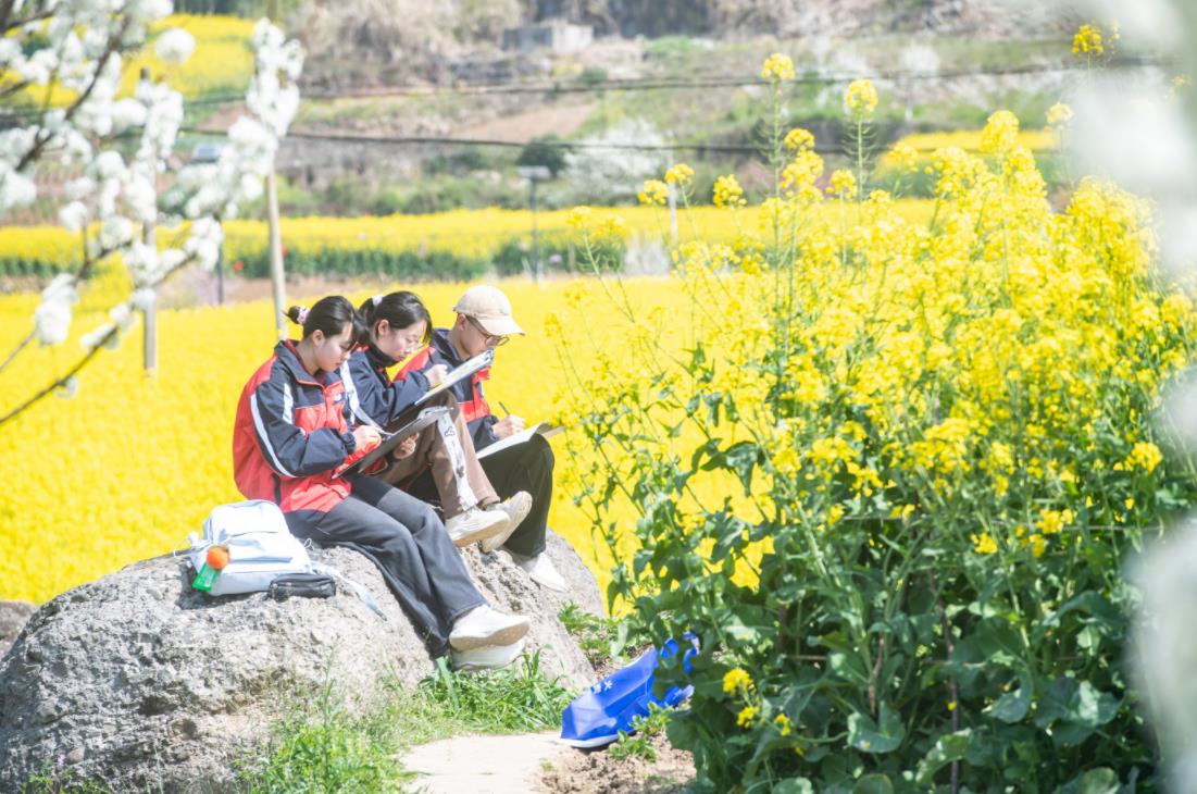 3月20日,重慶市巫山縣福田鎮(zhèn)的學(xué)生在油菜花田里寫生。新華社記者 唐奕 攝