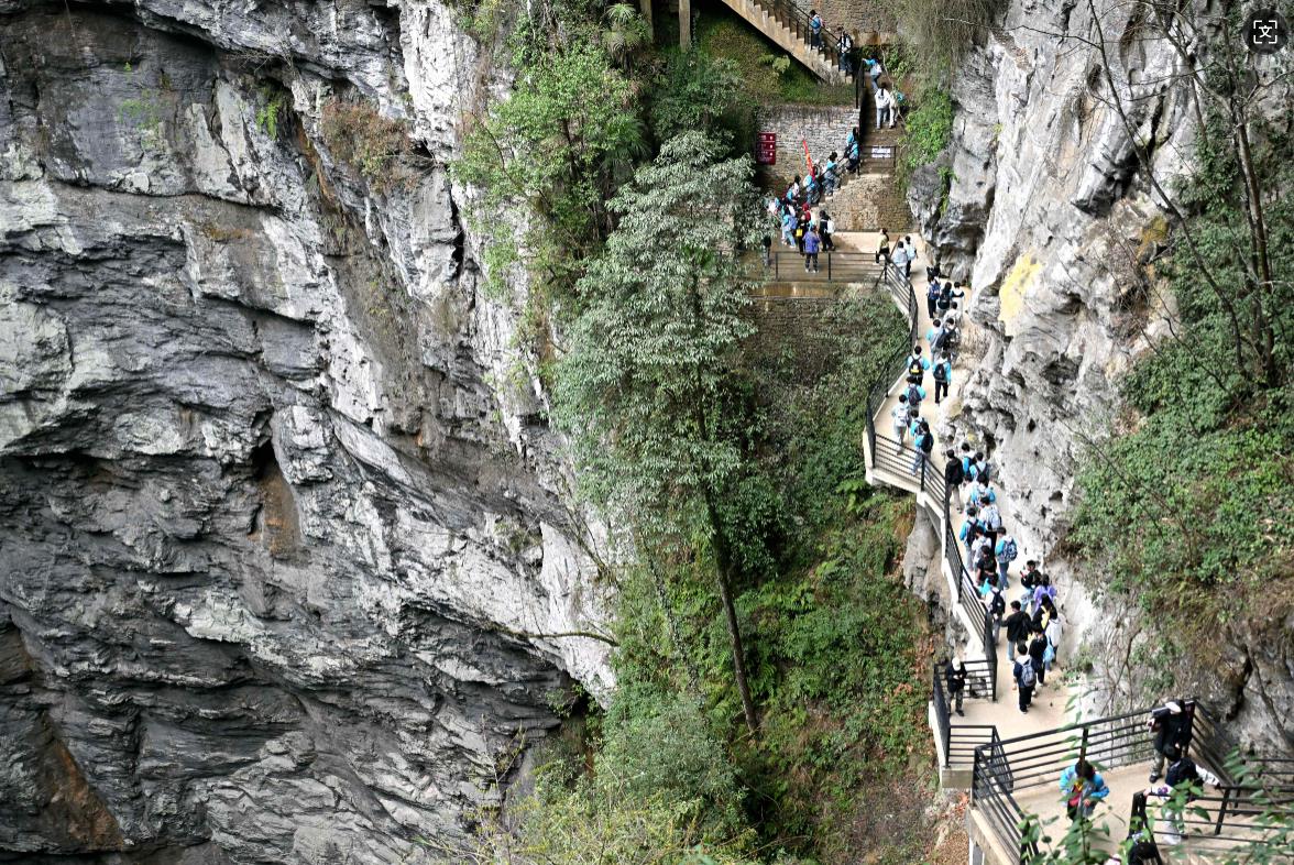 3月21日,湖北省宣恩縣清源高中的師生們行進(jìn)在鑼圈巖天坑的絕壁棧道上。 新華社發(fā)