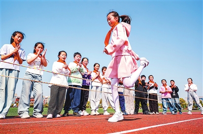 3月26日,江蘇省南通市通州區(qū)金樂小學(xué)的學(xué)生在課間“跳橡皮筋”。該校通過(guò)跳皮筋、滾鐵環(huán)、擲沙包等趣味項(xiàng)目讓學(xué)生在游戲中強(qiáng)健體魄。