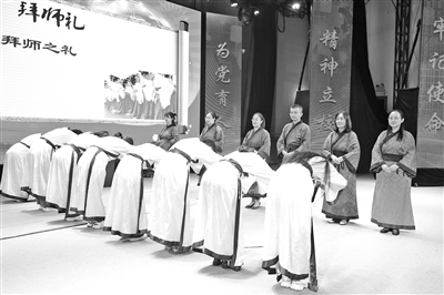 衡水中學(xué)青年教師向師傅行拜師禮。