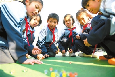 河北省邯鄲市叢臺區(qū)永和學校將傳統(tǒng)游戲與現(xiàn)代體育結合,圖為學生們在課間玩“彈玻璃球”游戲。周紹宗 攝
