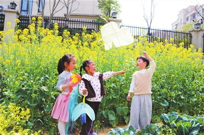 “兒童散學(xué)歸來(lái)早,忙趁東風(fēng)放紙鳶?!苯?,浙江省江山市江東科技幼兒園里的油菜花爭(zhēng)相斗艷,孩子們鉚足了勁兒比賽做風(fēng)箏。他們用塑料膜、紙板自制各種奇形怪狀的風(fēng)箏,并用彩筆繪制專屬圖案,通過(guò)研究風(fēng)向、風(fēng)力,調(diào)整風(fēng)箏的結(jié)構(gòu)、重量,努力讓風(fēng)箏翱翔天際。圖為孩子們?cè)诜棚w自制的風(fēng)箏。劉玉蘇 攝