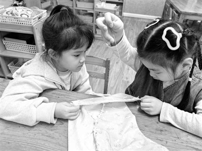 ①重慶市江津區(qū)幾江幼兒園的孩子們在為宋朝的小朋友做衣服。