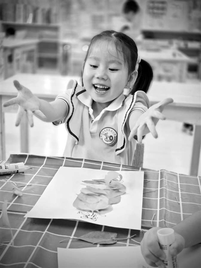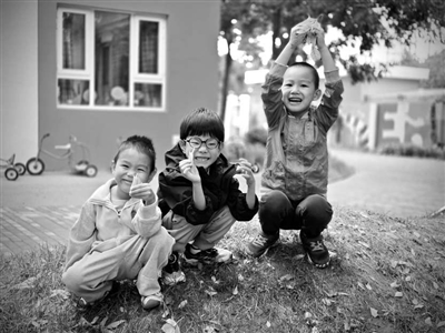②③北京市海淀區(qū)龍崗路幼兒園的孩子們用落葉做游戲。 幼兒園供圖