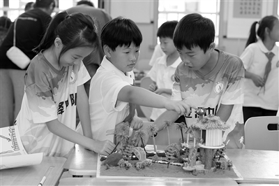 大圖:在李漁小學(xué)的“創(chuàng)生周”,學(xué)生學(xué)習(xí)制作李漁故居的標(biāo)志性建筑“且停亭”。