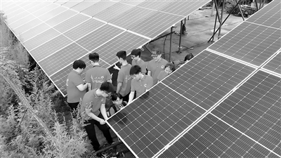 東北大學(xué)“智電興鄉(xiāng)”實(shí)踐團(tuán)成員在沈撫示范區(qū)拉古滿族鄉(xiāng)拉古村測(cè)量光伏板尺寸。學(xué)校供圖