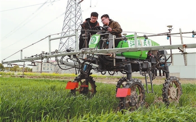 江蘇大學(xué)研發(fā)的自走式高地隙噴桿噴霧機(jī)在作業(yè)試驗(yàn)。本報(bào)記者 張學(xué)軍 攝(資料圖片)