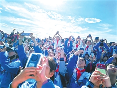 火箭升空時刻,學生們紛紛拍照留念。 本報記者 尹曉軍 攝