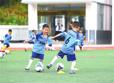 江西省贛州市定南縣第四小學(xué)學(xué)生在踢足球。 資料圖片