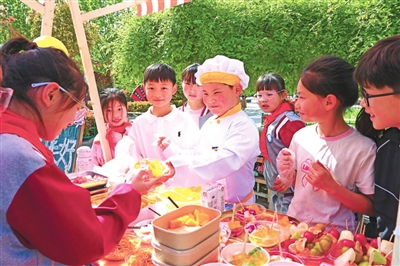 近日,江蘇徐州睢寧李集鎮(zhèn)中心小學(xué)學(xué)生將親手制作的果盤推薦給同學(xué)品嘗。該校舉辦廚藝比賽,100余名學(xué)生參與拼盤、烤串、切菜、炒菜等活動,感受勞動樂趣。 洪星 攝