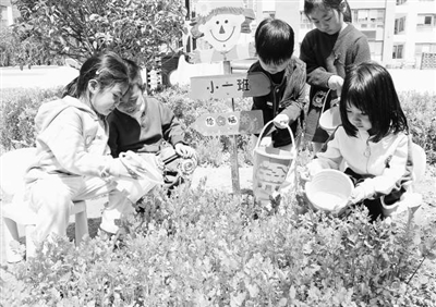 近日,青島市市北區(qū)樺川路幼兒園小一班幼兒在園內(nèi)特色種植區(qū)“童耕樂園”給本班責(zé)任田種植的香菜澆水。 孫軍 攝
