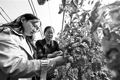 在天津天民田園農(nóng)業(yè)科技示范園,天津農(nóng)學(xué)院王麗娟教授(右)為科技小院的學(xué)生們提供學(xué)術(shù)指導(dǎo)。新華社記者 孫凡越 攝