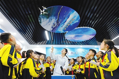 近日,在山東省棗莊市市中區(qū)文化路小學(xué)航天科普館,教師在講解“太陽能飛機(jī)”飛行知識(shí),為學(xué)生普及航天知識(shí),共筑航天夢(mèng)想。 吉喆 攝