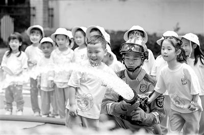 5月9日,福建省福州市鼓樓區(qū)水部街道吉的堡幼兒園,孩子們?cè)谙谰仍藛T的協(xié)助下體驗(yàn)使用消防水槍。謝貴明 攝