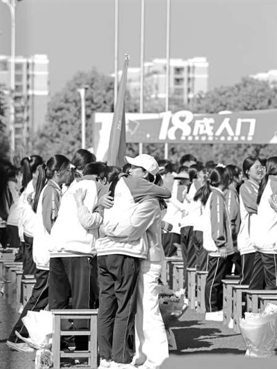 成人禮儀式上,學(xué)生與家長(zhǎng)相互擁抱。