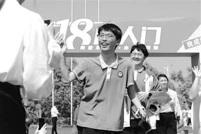 成人禮儀式上,學(xué)生們走過(guò)“成人門(mén)”后與教師擊掌。