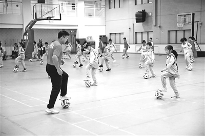 北京第一師范學(xué)校附屬小學(xué)體育教師帶領(lǐng)學(xué)生進(jìn)行踩拉球練習(xí)。學(xué)校供圖