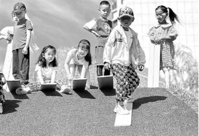 孩子們?cè)谏狡律蟿?chuàng)新滑板游戲玩法。田利珍 攝
