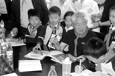 金翔龍?jiān)菏拷o文宣小學(xué)的學(xué)生們寫寄語。學(xué)校供圖