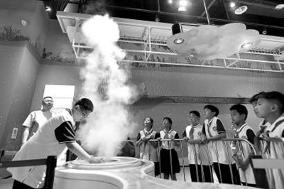 上圖:5月25日,山東省青島市市北區(qū)開平路小學(xué)學(xué)生在青島科技館體驗“空氣炮”裝置。