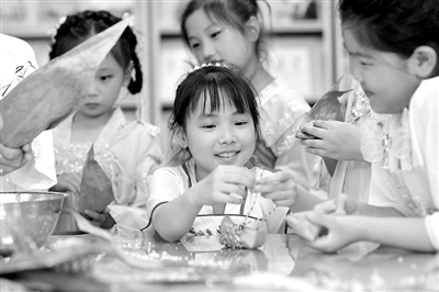 右圖:5月26日,山東省青島市市北區(qū)杭州路小學學生在體驗包粽子。王海濱 攝