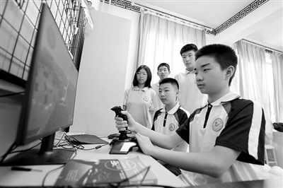 5月30日,內(nèi)丘縣第二中學學生在進行模擬飛行操控。
