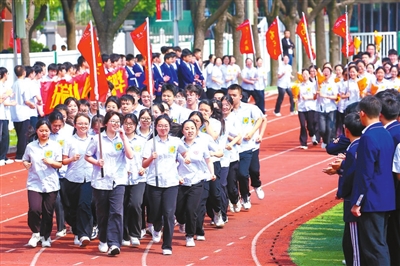 6月3日,江蘇省海安市實(shí)驗(yàn)中學(xué)在校田徑場(chǎng)隆重舉行儀式,師生們共聚一堂,為夢(mèng)想奔跑,為高考加油。顧彬斌 攝