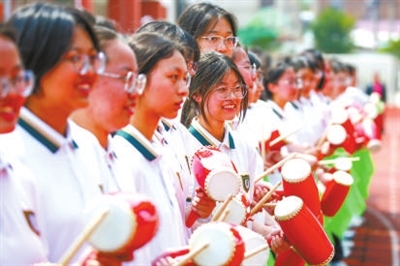 高一女子花鼓社團(tuán)的學(xué)生在為高三學(xué)長學(xué)姐加油助威。