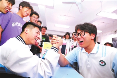 近日,安徽省淮北市第十二中學(xué)高三(6)班的學(xué)生在進(jìn)行掰手腕游戲。學(xué)校組織高三年級(jí)學(xué)生開(kāi)展心理健康輔導(dǎo)活動(dòng),通過(guò)各種減壓游戲緩解學(xué)生應(yīng)考?jí)毫?,幫助學(xué)生增強(qiáng)自信,以平和、樂(lè)觀的心態(tài)迎接高考。