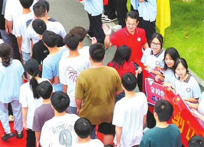 ① 6月6日,在湖南省道縣道州玉潭(東陽(yáng))學(xué)校,教師與考生擊掌加油。蔣克青 蔣憑姣 攝