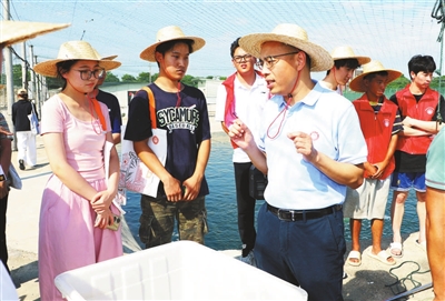 謝潮添在養(yǎng)殖現(xiàn)場為學(xué)生授課。本報(bào)記者 熊杰 攝