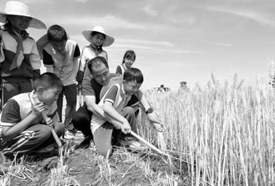 近日,學(xué)生在教師的指導(dǎo)下收割小麥。梁孝鵬 攝