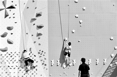 圖①:上海市普陀區(qū)洵陽路小學(xué)的學(xué)生正在進行“難度攀巖”項目訓(xùn)練。夏豪棟 攝