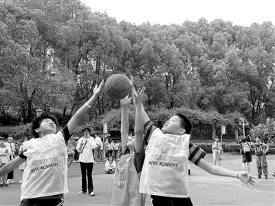 圖②:上外—黃浦外國語小學(xué)3V3籃球班班賽在操場如火如荼地進行。沈華曉 攝