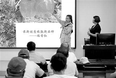 6月16日,在位于陜西省渭南市白水縣的西北農(nóng)林科技大學(xué)蘋(píng)果試驗(yàn)站,老師和翻譯為培訓(xùn)班學(xué)員介紹中國(guó)蘋(píng)果新品種。