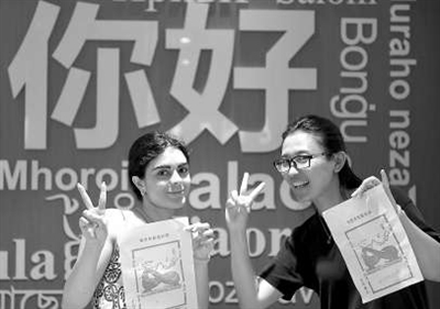 6月17日,北京外國語大學(xué)的意大利畢業(yè)生馬芙藍(lán)(左)與她的老師田衛(wèi)衛(wèi)一起展示她們制作的木版水印作品。