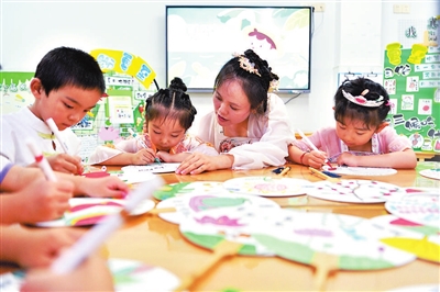 6月20日,夏至即將到來,在湖北省襄陽市??悼h縣直機(jī)關(guān)第二幼兒園,教師指導(dǎo)孩子畫團(tuán)扇。楊韜 龔雪 攝