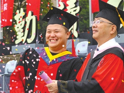 6月22日上午,在華中農(nóng)業(yè)大學(xué)2025屆畢業(yè)生學(xué)位授予儀式現(xiàn)場,該校副校長青平教授(右)為博士學(xué)位獲得者撥穗后,與其共同擰開手持禮花筒并合影。劉濤 攝